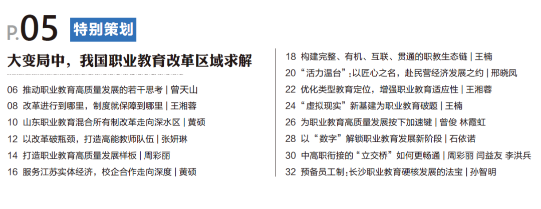 聚焦职业教育部省共建省份,山东省混合所有制改革一直走在全国前面,2015年率先以省为单位开展混合所有制办学改革试点,已成为全国混合所有制改革的“策源地”;探索建立“职教高考”制度,实现职教、普教并行双轨道。在学校技术服务能力的提升、人才培养模式的转变、相关激励政策的颁布实施,以及各职业院校的积极探索下,江苏校企合作逐渐走向深处。全国首个以城市群为单元的苏锡常都市圈,整体协同推进职教改革,创新成果惠及全省。浙江以制度创新推进温州、台州职业教育与民营经济融合发展,“活力温台”服务长三角一体化发展和浙江“重要窗口”建设。首个国家级虚拟仿真实训基地落户江西,“虚拟现实”新基建为职业教育破题。广州打破升学天花板,加强纵向贯通、横向融通,建设现代职业教育体系。深圳职业教育开启数字化转型,力求培养出更多适配大湾区新业态、新产业发展的人才。成都从机制创新、体系构建、渠道拓宽等方面探索了中高职贯通人才培养的实践路径。长沙实施以预备员工制为主要特点的现代学徒制解决职业院校实习实训设备不足、技术落后、效果不实的问题,激发企业参与校企合作的积极性,地方政府向宏观引导转变,职业教育向市场驱动转变……多地区域探索经验,为我国职业教育发展提供了实践参考。我们相信,新时代职业教育大有可为,也必然大有作为!