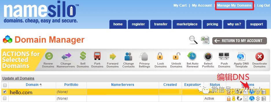 进入 Namesilo -> “Manage My Domains” -> 编辑 DNS。