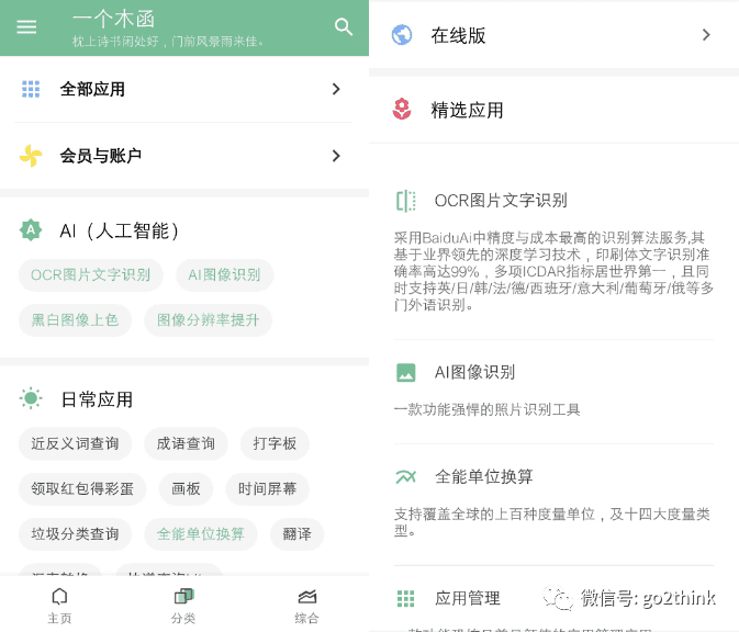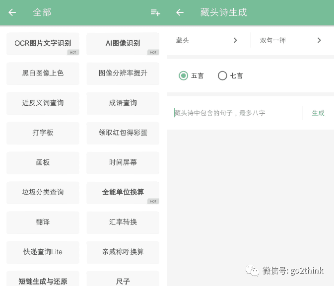 全部应用一共包含了几十款实用小工具,比如 OCR 识别、图片上色、时间屏幕、尺子、翻译、藏头诗等等。