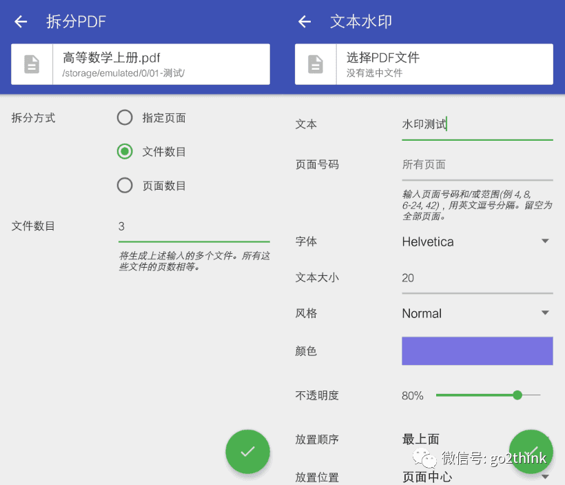 点击名称,进入功能界面,选择文件(PDF、图片、文本),调整设置参数,点击右下角的对号开始处理。