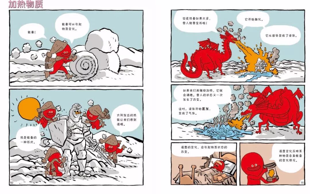 而漫画中,为了体现加热物质和冷却物质发生的变化,“物质”化身“百变小超人”,它的形象也在不断发生变化——从一个到多个,加热的时候变成喷火巨龙,冷却的时候变成青色的小人和雪花的形状。