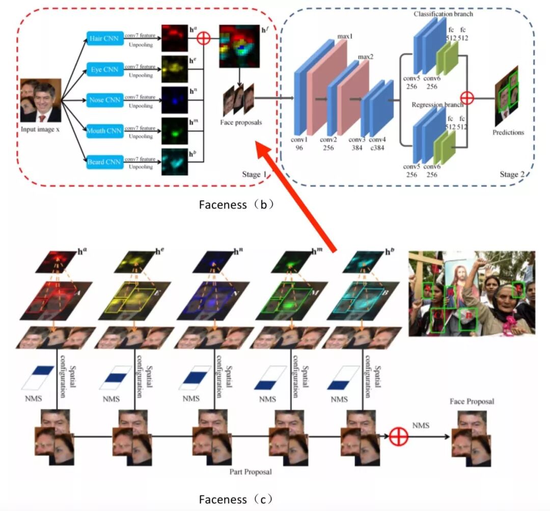 Faceness-Net[19]是一个典型的由粗到精的工作流,借助了多个基于DCNN网络的facial parts分类器对人脸进行打分,然后根据每个部件的得分进行规则分析得到Proposal的人脸区域,最后通过一个Refine的网络得到最终的人脸检测结果。整体流程如图 Faceness(b)。