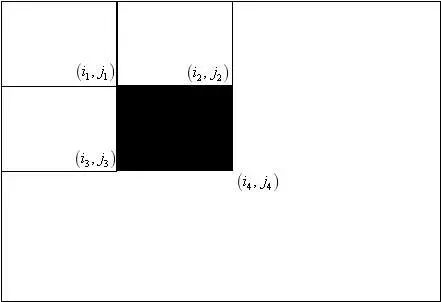 即原始图像在任何一点处的左上角元素之和。在构造出积分图之后,借助于它可以快速计算出任何一个矩形区域内的像素之和,以下图中的矩形框为例: