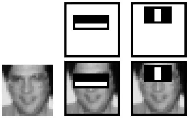 之所以这样,是因为黑色区域内的像素值之和等于这4个矩形框内的像素值之和,减去上面两个矩形框的像素值之和,再减去左边两个矩形框的像素值之和,这样做的话,左上角的矩形框被减了两遍,因此要加一遍回来。在计算出任何一个矩形区域的像素值之和后,可以方便的计算出上面任何一种Haar-like特征。下图是通过AdaBoost算法自动筛选出来的对区分人脸和非人脸有用的Haar-like特征,基本符合人类的直观感受: