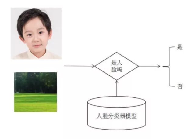 经典的人脸检测算法流程是这样的:用大量的人脸和非人脸样本图像进行训练,得到一个解决2类分类问题的分类器,也称为人脸检测模板。这个分类器接受固定大小的输入图片,判断这个输入图片是否为人脸,即解决是和否的问题。人脸二分类器的原理如下图所示: