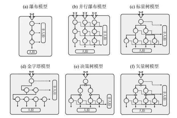 分类器级联结构,如Soft Cascade,将VJ方法的多个强分类器改成一个强分类器(该算法后面会有介绍)。另外,检测处于各种角度和姿态的人脸是研究另一个重点,VJ方法的分类器级联只有一条路径,是瀑布模型,改进的方案有树状级联,金字塔级联等,篇幅所限这里不做过多解释,各种级联方案如下图所示:
