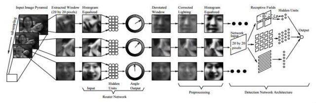 早期有代表性的成果是Rowley等人提出的方法[1][2]。他们用神经网络进行人脸检测,用20x20的人脸和非人脸图像训练了一个多层感知器模型。文献[1]的方法用于解决近似正面的人脸检测问题,原理如下图所示: