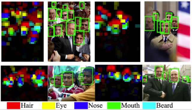 根据attribute-aware深度网络生成人脸部件map图(partness map),如上图Faceness(a)中的颜色图,文章共使用了5个部件:hair,eye,nose,mouth,beard. 通过part的结合计算人脸的score.部件与部件之间是有相对位置关系的,比如头发在眼睛上方,嘴巴在鼻子下方,因此利用部件的spatial arrangement可以计算face likeliness. 通过这个打分对原始的人脸proposal进行重排序. 如图Faceness(b)。
