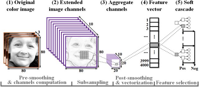 ACF[15](Aggregate Channel Features for Multi-view Face Detection)是一种为分类提供足够多的特征选择的方法。在对原图进行处理后,得到多通道的图像,这些通道可以是RGB的通道,可以是平滑滤波得到的,可以是x方向y方向的梯度图等等。将这些通道合起来,在此基础上提取特征向量后续采用Soft-Cascade分类器进行分类。
