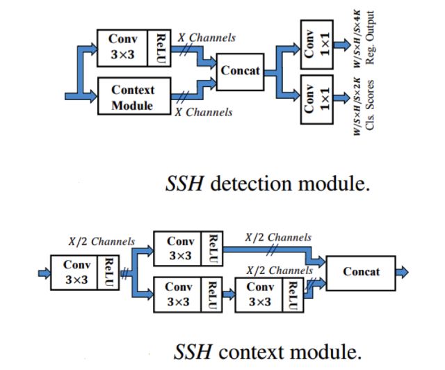 其中,M模块如上图所示,包含了分类和回归2个任务,其中Context Module的为了获得更多的上下文信息,更大的感受野,对该模块使用了等价的5*5和7*7的卷积分别进行操作,然后进行特征的concat最终形成了上图的Context Module。(由于大的卷积核效率问题,根据INCEPTION的思想,使用2个3*3的卷积核替代一个5*5的卷积核,使用3个3*3的卷积核替换1个7*7的卷积核)。