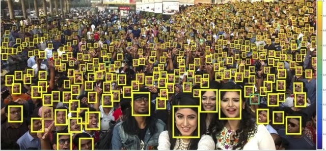 之前我们讲过的一些方法都没有针对小目标去分析,小目标检测依然是检测领域的一个难题,[21]本文作者提出的检测器通过利用尺度,分辨率和上下文多种信息融合来检测小目标,在上图的总共1000个人脸中成功检测到约800个,检测器的置信度由右侧的色标表示。