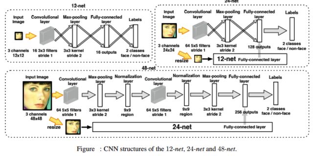 12x12,24x24,48x48尺寸作为输入的分类CNN网络结构,其中输出为2类-人脸和非人脸。
