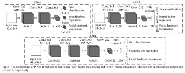 MTCNN[20]顾名思义是多任务的一个方法,它将人脸区域检测和人脸关键点检测放在了一起,同Cascade CNN一样也是基于cascade的框架,但是整体思路更加巧妙合理,MTCNN总体来说分为三个部分:PNet、RNet和ONet,如下图所示: