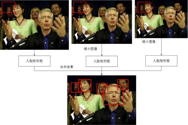 由于一个人脸附件可能会检测出多个候选位置框,还需要将检测结果进行合并去重,这称为非极大值抑制(NMS)。多尺度滑动窗口技术的原理如下图所示: