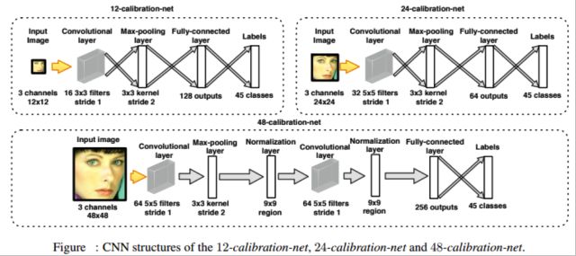 12x12,24x24,48x48尺寸作为输入的矫正(calibration)CNN网络结构。其中输出为45中种矫正模式的类别。