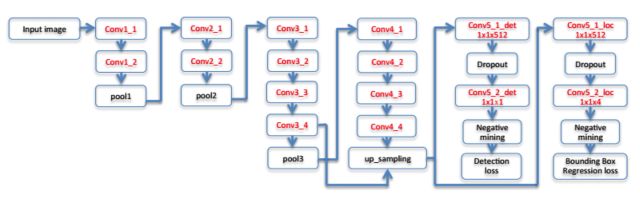 为了提高检测精度,采用了多尺度融合的策略。将conv3_4和conv_4_4的卷积结果拼接起来送入后面处理。由于两个层的输出图像大小不同,在这里用了上采样和线性插值对小的图像进行放大,将两种图像尺寸变为相等。