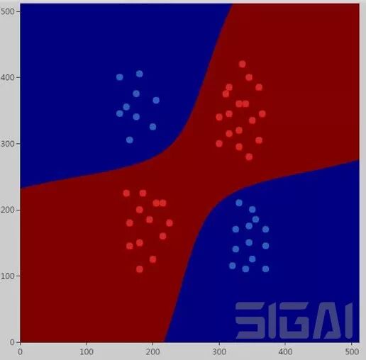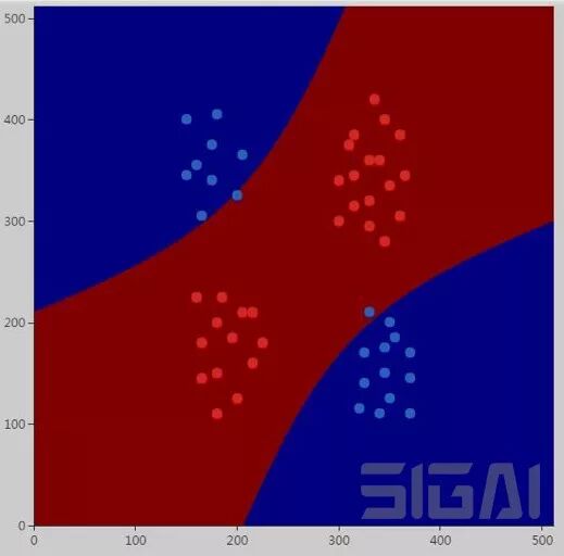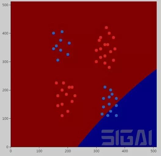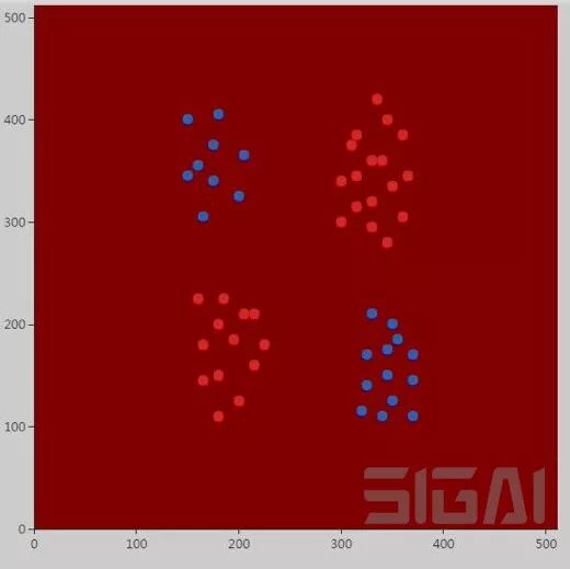 所有样本都被判定成红色。不出所料,使用线性核的SVM是无法解决异或问题的。