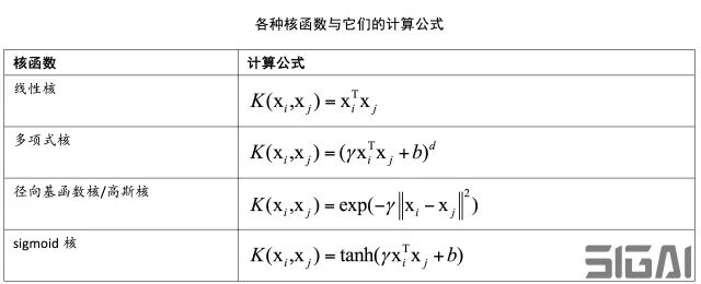在这里K为核函数。常用的非线性核函数有多项式核,高斯核(也叫径向基函数核,RBF)。下表列出了各种核函数的计算公式: