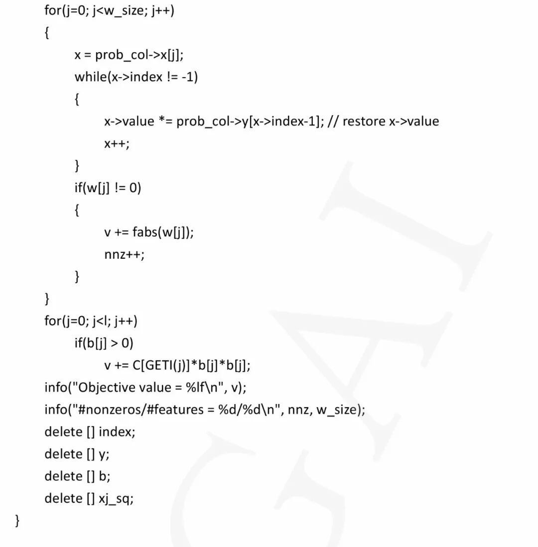 下面来看源代码实现。函数solve_l1r_l2_svc实现求解L1正则化L2损失函数支持向量机原问题的坐标下降法。在这里我们重点看牛顿方向的计算,直线搜索,参数更新这三步,其他的可以忽略掉。代码如下:
