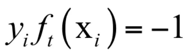 因此弱分类器的权重大于0。弱分类器的错误率小于0.5是能保证的,如果准确率小于0.5,只需要将弱分类器的输出反号即可。对于被弱分类器正确分类的样本,有: