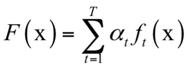 其中x是输入向量,F (x)是强分类器,ft (x)是弱分类器,αt是弱分类器的权重,T为弱分类器的数量,弱分类器的输出值为+1或-1,分别对应正样本和负样本。这里的弱分类器就是上面的8位医生,强分类器代表他们的集体决策。弱分类器的结果就是前面例子中每个医生的诊断结果,如果一个医生的判定结果为+1,表示病人为阳性,-1则为阴性。