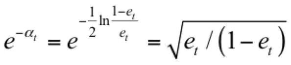 在这里考虑了样本权重值。因为可以保证在训练集上弱分类器的正确率大于0.5,所以有: