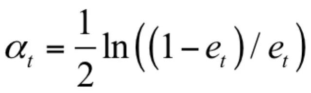 根据计算公式,错误率低的弱分类器权重大,它是准确率的增函数。沿用医生集体会诊的例子,如果在之前的诊断中医生的技术更好,对病人情况的判断更准确,那么可以加大他在此次会诊时说话的分量即权重。弱分类器在训练样本集上的错误率计算公式为: