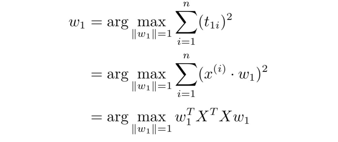 为了使变换不改变数据的大小,我们让 W 中的每个列向量 wi 的长度都为1,也就是||wi|| = 1。T 中的各个列向量为 <t1, t2, ..., tm>。为了使第一主成分 (t1) 的方差最大,