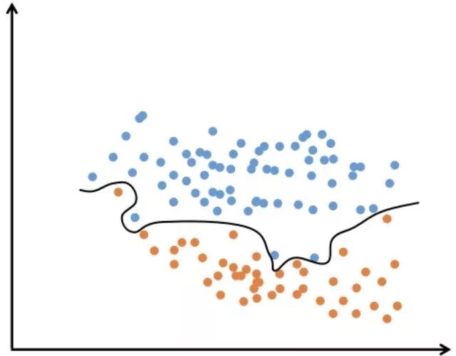 在上图中训练样本存在噪声,为了照顾它们,分类曲线的形状非常复杂,导致在真实测试时会产生错分类。