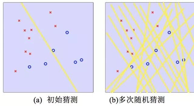 如果你对上一节的的计算过程真的理解的话, 你应该知道这就是一个计算过程,对计算机而言,第一步也只能是猜一个,猜一个点对(w=-1,b=2)如图5(a),这就表示一条二维平面上的一条直线。评价标准呢?很简单,就是让直线把两类样本分开,可是你的运气实在不好,这条直线简直太糟糕了,不管是人还是计算机,通过简单的判断就知道这条直线不是我们要的。然后你就必须更新你的猜测,这个问题非常类似于求解