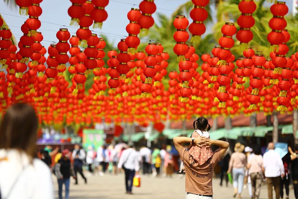 2021年2月17日,海南三亚,休假的父母带着孩子在南山文化旅游区游览,孩子坐在父亲的肩头享受时光