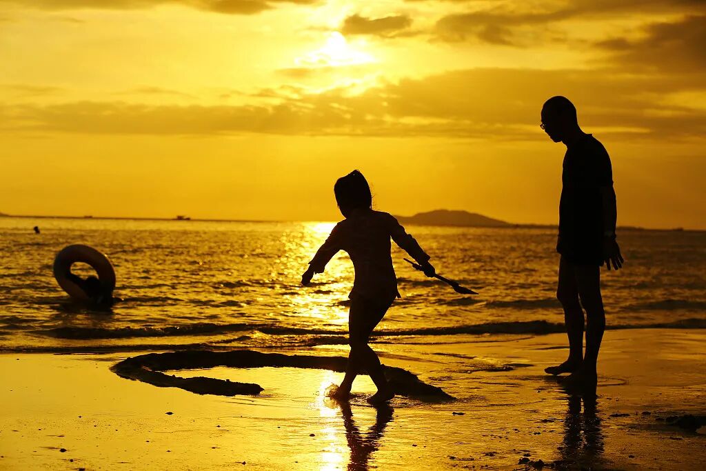 2021年1月16日,海南三亚,家长带着孩子在三亚湾海边夕阳中游玩