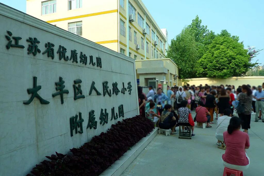 2018年8月10日,江苏省盐城市大丰区人民路小学附属幼儿园门前,许多家长一大早就搬小板凳前来排队,等待小班新生预约登记