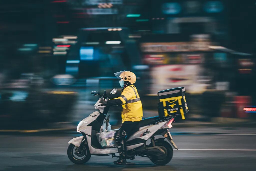 穿行在城市夜色中的外卖小哥