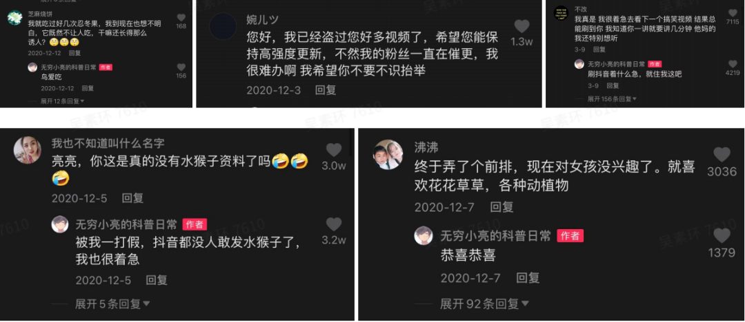 在短视频领域,这一数字涨得更快。从0飙升到1600万,抖音号无穷小亮的科普日常只用了一年多。其中的节目合集《亮记赶海》、《身边的花鸟鱼虫》等播放量上亿,《网络热传生物视频》播放量更是突破10亿。