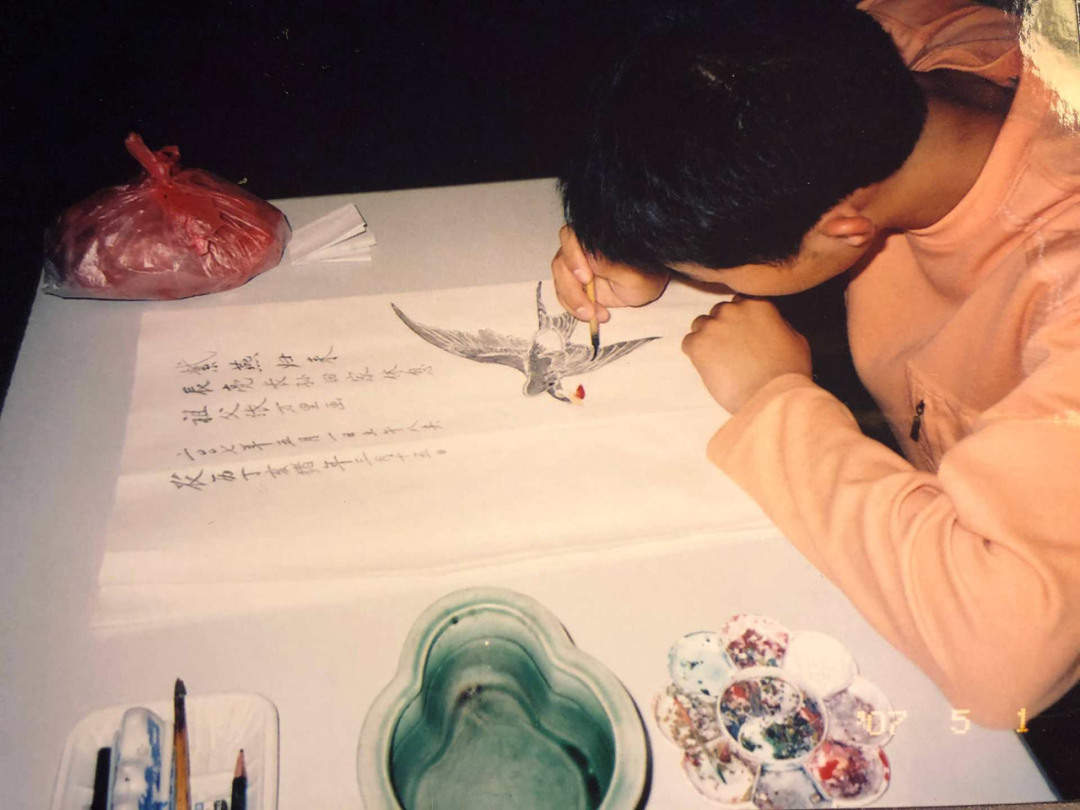 大一放假,小亮从南京回到北京家中,为爷爷画的鸟儿上色