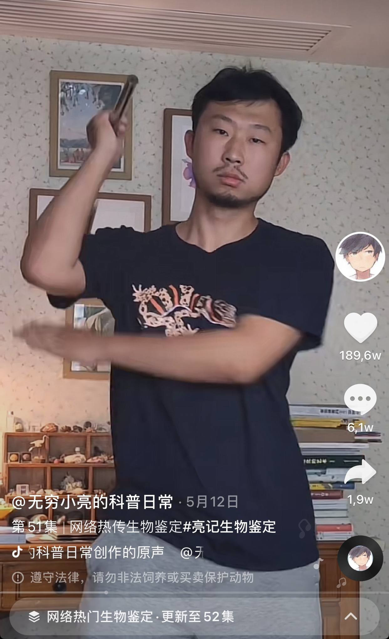 5月26日,无穷小亮的科普日常在抖音首发第30期《网络热门生物鉴定》。视频全长6分27秒,点赞达到162万。其中,他出镜的50多秒被网友们截取下来激情二创,#⽆穷⼩亮表情包 冲进抖音热榜。