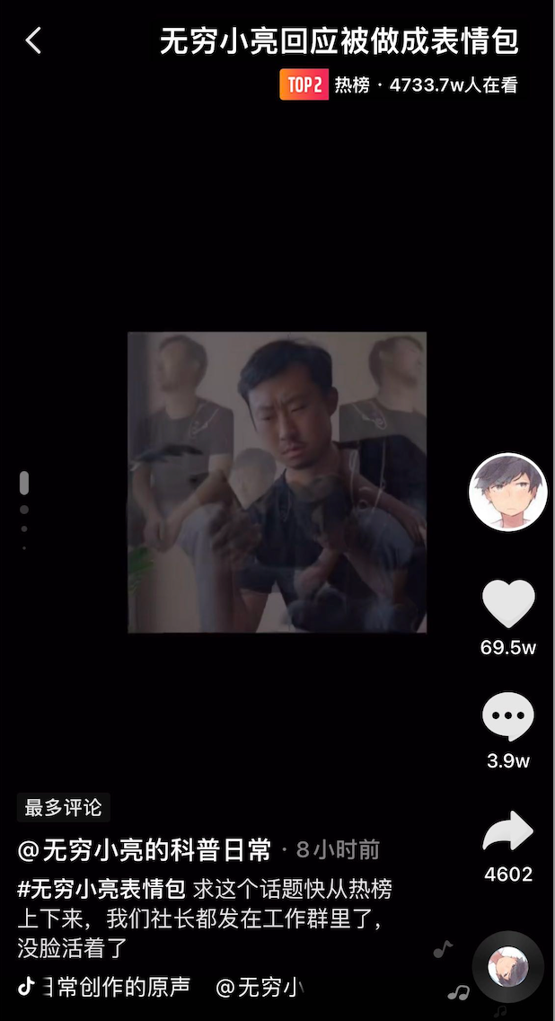#⽆穷⼩亮回应被做成表情包 冲进抖⾳热榜第⼆位