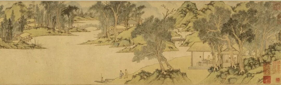 这说的是:那小小的国度,稀少的人民,让那些超过十人、百人这样有才华的人也用不着了。让人民爱惜生命而不愿意远徙外地,即使有舟船车轿,也用不着乘坐;即使有盔甲兵器,也用不着陈列;让人民回复到远古结绳记事的时代,品尝甘甜的食物,穿着丰美的衣服,居住安适的处所,悦乐文雅的风俗,那接连的国度彼此相望,鸡啼狗吠的声音彼此相应感通,人民直到老死也不必急着往来。浒溪草堂画芯 明 文徽明