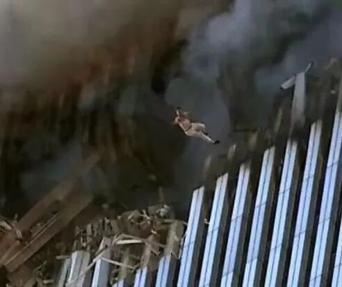 图为世贸大厦里的工作人员被震飞的瞬间。