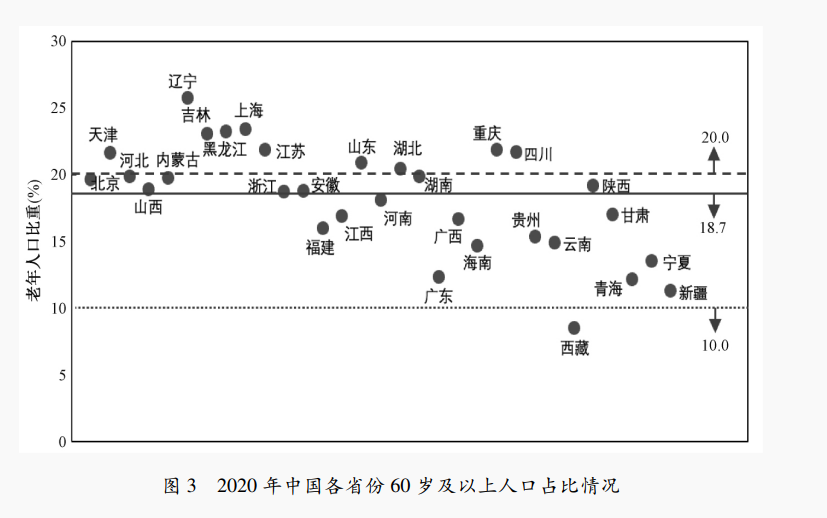 首先按照社会经济分区来看,东北地区的老龄化程度最为严重,60岁及以上人口和65岁及以上人口占地区总人口比重分别达24.00%和16.21%,已经进入了中度老龄化阶段;东部地区和中部地区的老龄化程度较为接近,60岁及以上人口和65岁及以上人口占地区总人口比重分别为18.85%左右和13.50%左右;西部地区的老龄化程度最低,60岁及以上人口和65岁及以上人口占地区总人口比重分别为16.00%和11.60%。其中东部地区是社会经济发展水平最好的地区,老龄化程度居中;东北地区和西部地区社会经济发展水平均较低,老龄化水平呈现出一高一低的突出特点,且东北地区已经进入中度老龄化阶段。但四分区法仅以社会经济发展程度为依据进行划分,各地区内部囊括的省份较多且地理分布广阔,尤其是西部地区就包含了我国大部分地理区域,因此尚无法更加精细地反映出不同行政和自然地理区域的老龄化差异。按照行政地理分区来看,东北地区仍然是老龄化程度最严重的地区;华北地区、华东地区和华中地区呈现出相近的老龄化水平,60岁及以上人口和65岁及以上人口占地区总人口比重分别为19.50%左右和14.00%左右,超过全国的平均水平;华南地区和西北地区为老龄化程度最低的区域,60岁及以上人口和65岁及以上人口占地区总人口比重分别为14.60%和10.40%左右,尚未达到全国平均水平;而西南地区的老龄化水平居中,60岁及以上人口和65岁及以上人口占地区总人口比重分别为16.48%和12.40%,略低于全国平均水平。由此可见,以全国平均水平为基准,七类地区表现出4种老龄化水平(详见图2,虚线为全国平均水平)。此外,对比各地区“六普”和“七普”65岁及以上人口占比数据可以发现,我国老龄化的地区差异更加明显。具体来说,从社会经济分区来看,“六普”数据显示各地区65岁及以上人口占比差值范围为0.04%—0.98%,而“七普”数据显示的各地区65岁及以上人口占比差值范围为0.48%—4.61%;从行政地理分区来看,“六普”数据显示各地区65岁及以上人口占比差值范围为0.08%—2.28%,而“七普”数据显示的各地区65岁及以上人口占比差值范围为0.01%—5.82%。总体而言,我国老龄化的地区差异较以往更加明显,且无法用任何一种因素(如经济、气候、地理条件等)完全加以解释,因此地方性政策和措施需要分类指导、因地制宜,采取更有针对性的老龄化应对方略。(三)老龄化省际差异呈样多样化,分省应对回旋空间明显增大我国老龄化水平除存在显著的地区差异外,也存在多样化的省际差异。图3和图4分别展示了“七普”数据中我国各省份60岁及以上人口和65岁及以上人口的占比情况,图中的实线为全国平均水平,图中的短虚线和长虚线分别为轻度老龄化标准(即60岁及以上人口占比达10.0%或65岁及以上人口占比达7.0%)和中度老龄化的标准(即60岁及以上人口占比达20.0%或65岁及以上人口占比达14.0%)。![]()