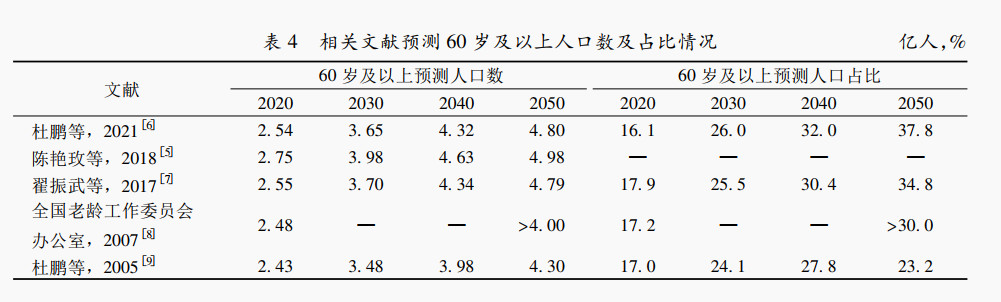 自2000年我国进入老龄化社会后,老年人口规模和比例保持加速增长的态势,仅二十年间,60岁及以上人口占比增加了8个百分点。但是,要达到对我国人口老龄化的充分认识,不仅需要充分回顾过去,更需要动态认识和预判其未来发展趋势。老龄化的发展并非一项匀速、同向的简单运动,其特征是动态发展和变化的,需要人口学者持续保持敏锐,时刻利用有效数据和信息进行判断。当前的老龄化速度尚未达到最快,未来老龄化人口将继续加速增长。表4展示了以往不同的代表性文献对我国人口老龄化程度的预测情况,可以看出以往对目前老年人口数量和占比的增长预测基本都是低估的。第七次人口普数据显示,2020年我国60岁及以上人口数量为2.64亿,占总人口比重为18.7%,而除了陈艳玫等预测2020年60岁及以上人口数量为2.75亿人外,其余均低于实际人口数值,因此以以往的人口发展状况为准将低估未来人口老龄化的发展速度从而导致盲目乐观,未来人口老龄化的进展将远快于预测水平,需要根据实际变化进一步对老年人口预测进行调整。![]()