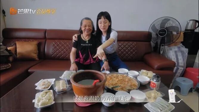 △阔别多年,GiGi炎明熹回汕尾跟家人齐聚吃擂茶和菜粿。/视频截图