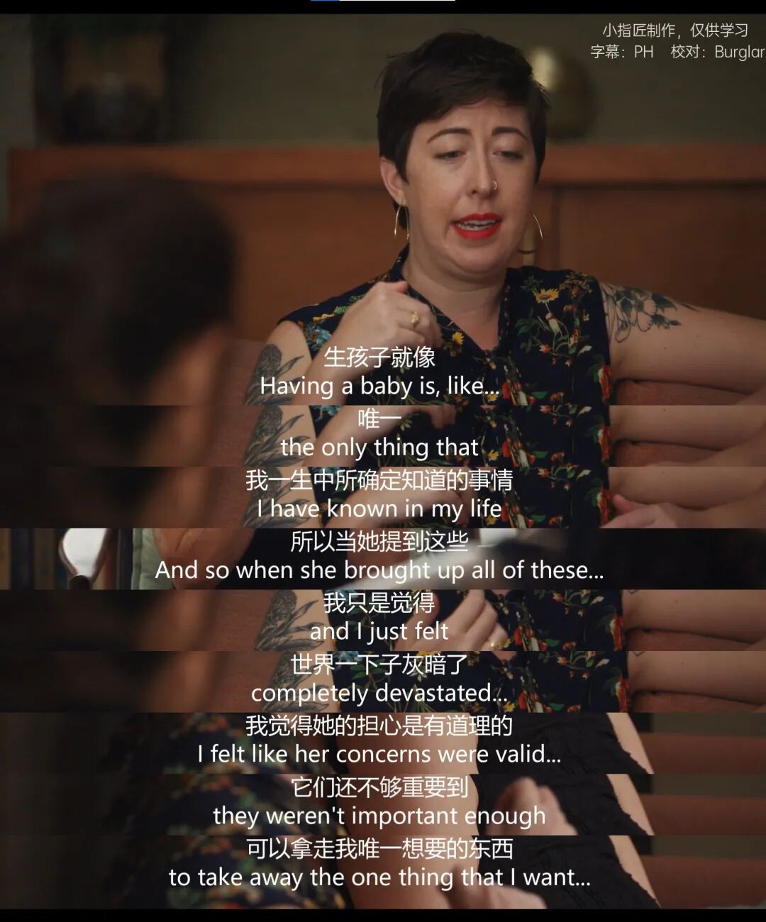 而在Lauren看来,生一个孩子是自己一直以来坚定的事情,而Sarah对生育和成为母亲的迟疑让她感到绝望,好像是夺走了自己最大的期待。她理解Sarah的担忧,但因此而放弃成为母亲让她觉得不公平,甚至陷入了抑郁情绪中……