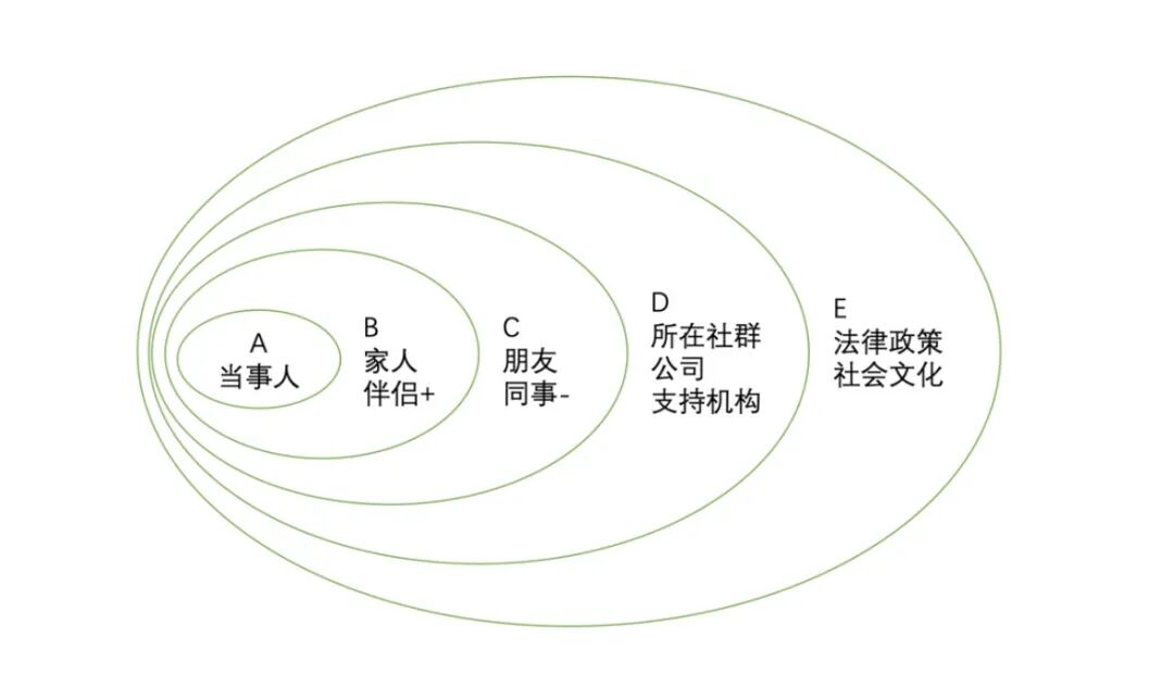 除了我们的服务者之外,就像受害者援助资源生态图所示意的,家人、伴侣、朋友、同事同样是能够为受害者提供帮助的支持者们。