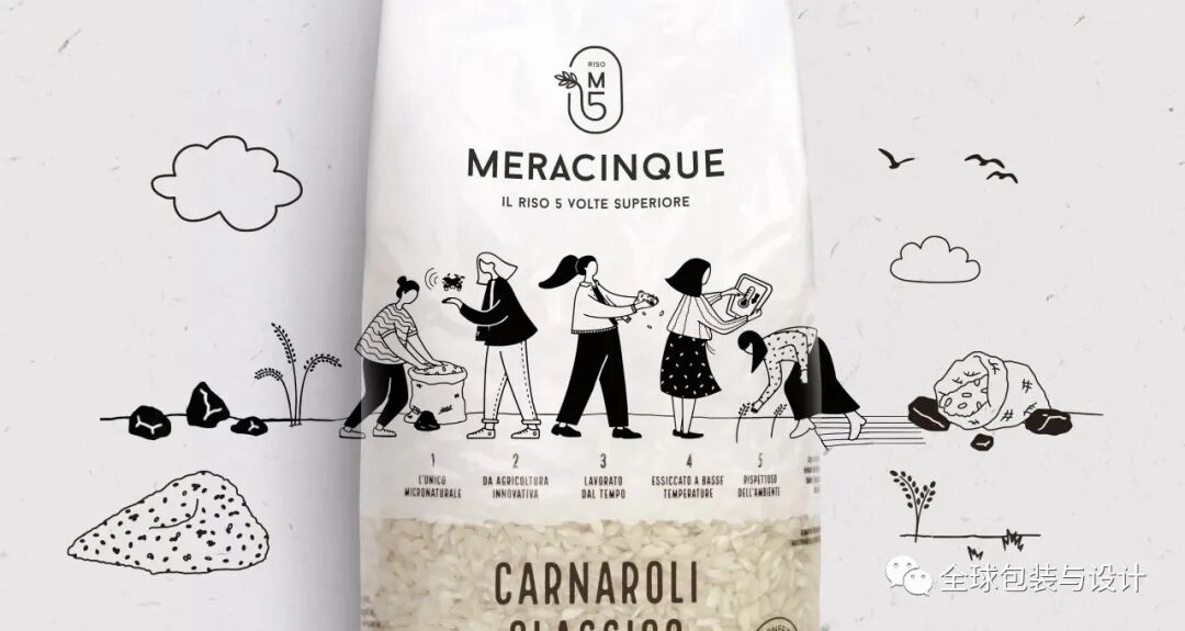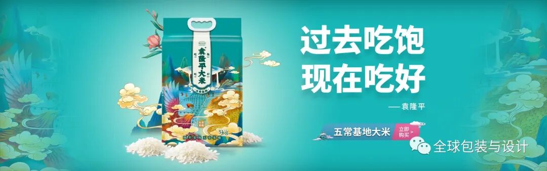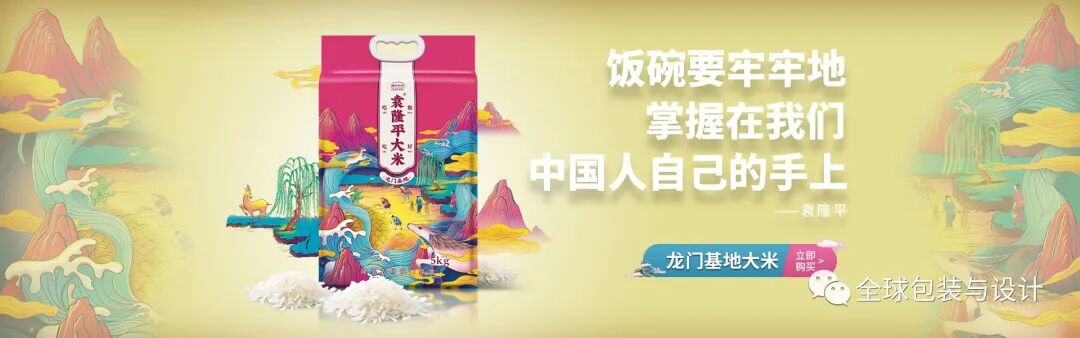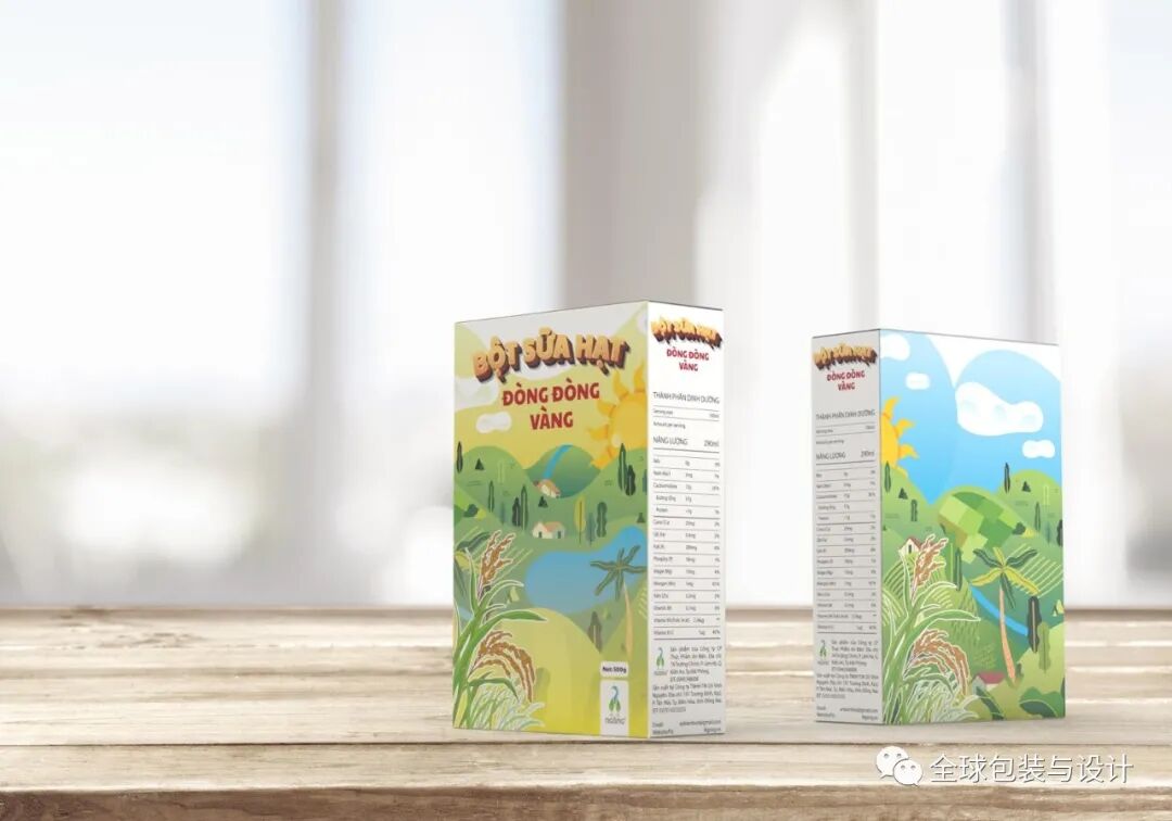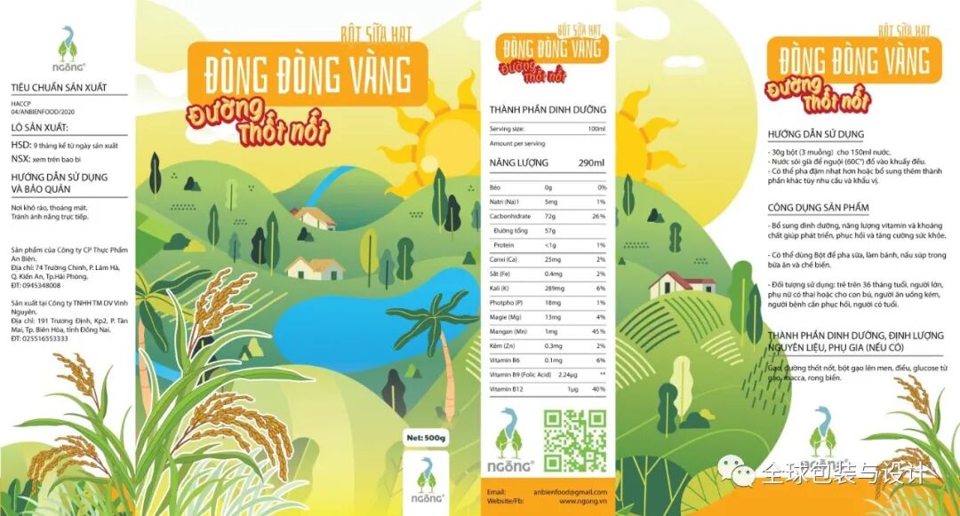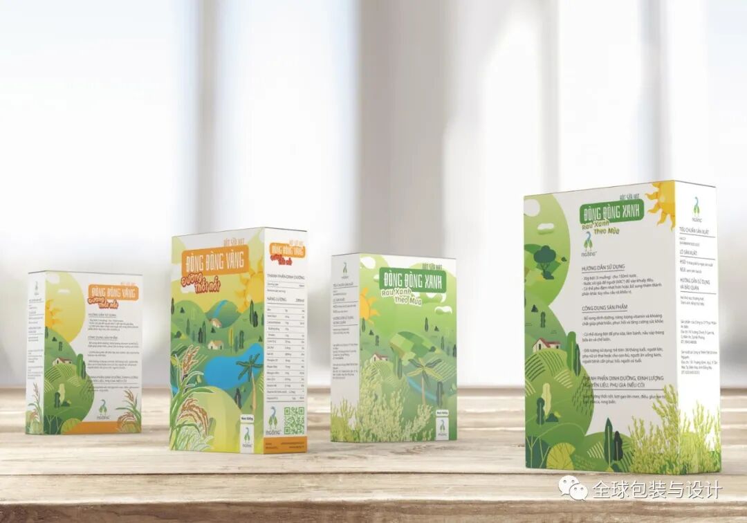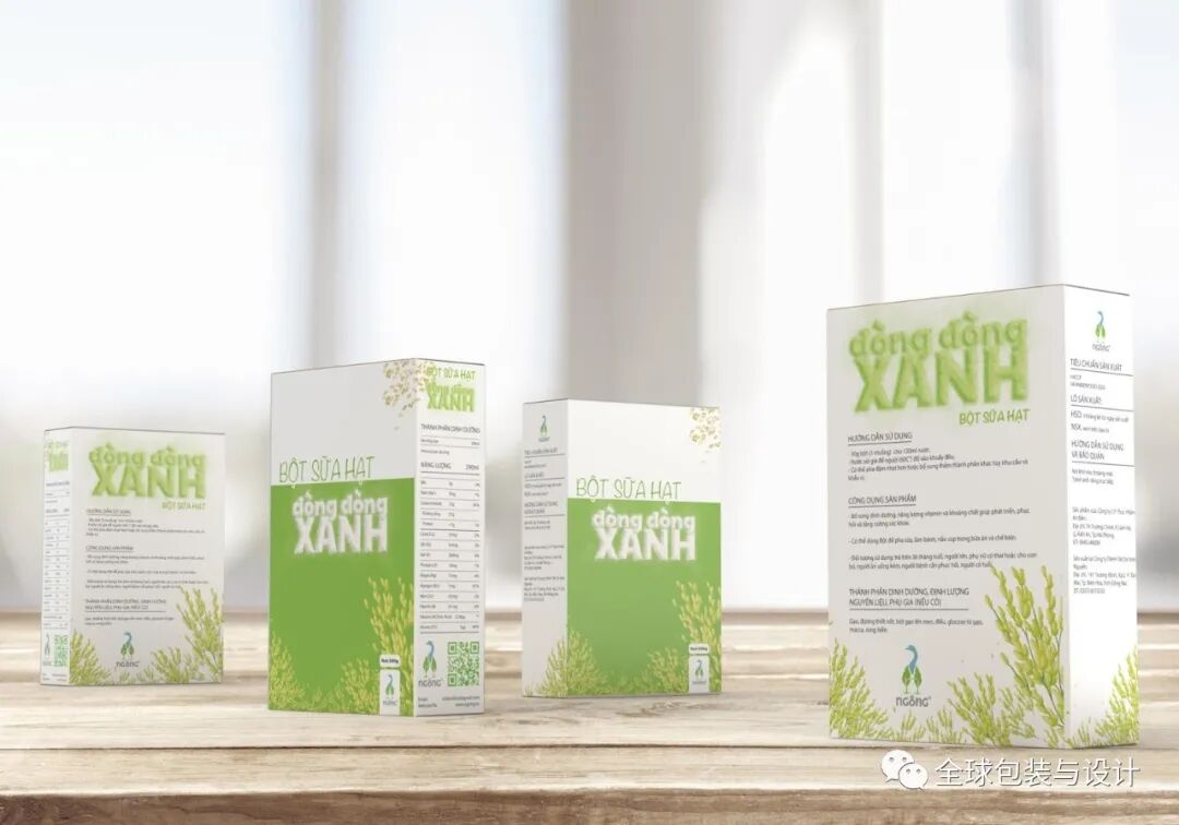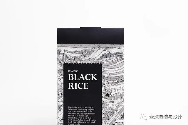 这种设计只有3种颜色:绿色、白色和黑色。产品的图像、内容和条形码为黑白两色,描绘稻谷无限绿色的高频绿色。