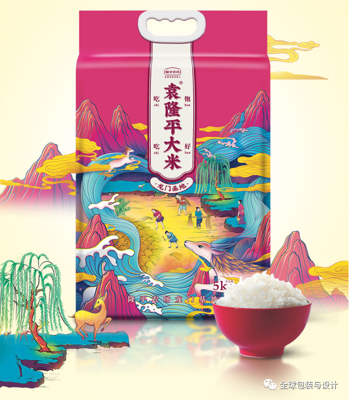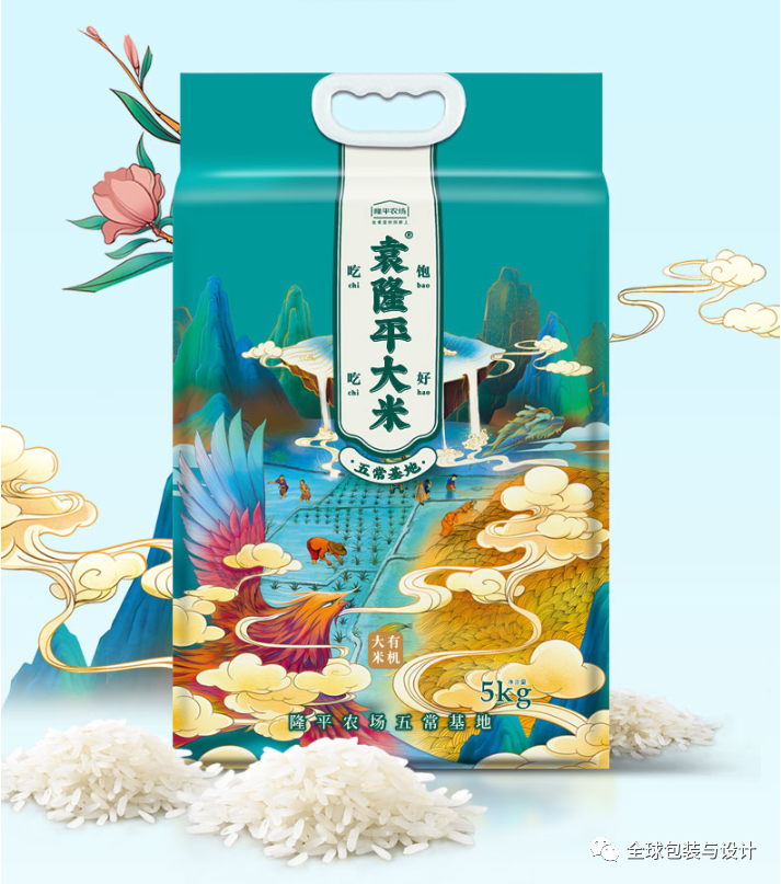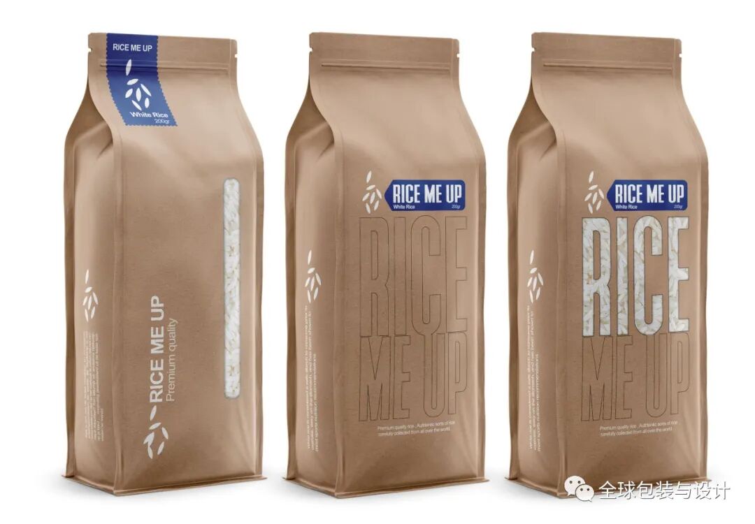 小袋上的书法毛笔插图是手绘的,反映了水稻和稻田的自然形态。每种图案都是根据包装的大米类型定制的。