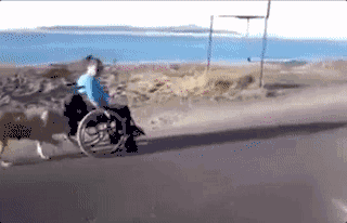 一只大狗用头顶着轮椅,