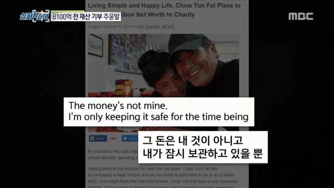 韩国《中央日报》12月20日报道,周润发19日在韩国MBC电视台的综艺节目中表示:要捐出8100亿韩元(约合50亿人民币)的全部财产,完全属实。