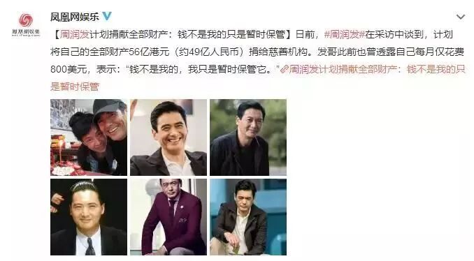与之形成鲜明对照的是,63岁的周润发日前在接受香港杂志《Jayne Stars》采访时谈到,计划将自己的全部财产,即56亿港币,全部捐献给慈善机构。